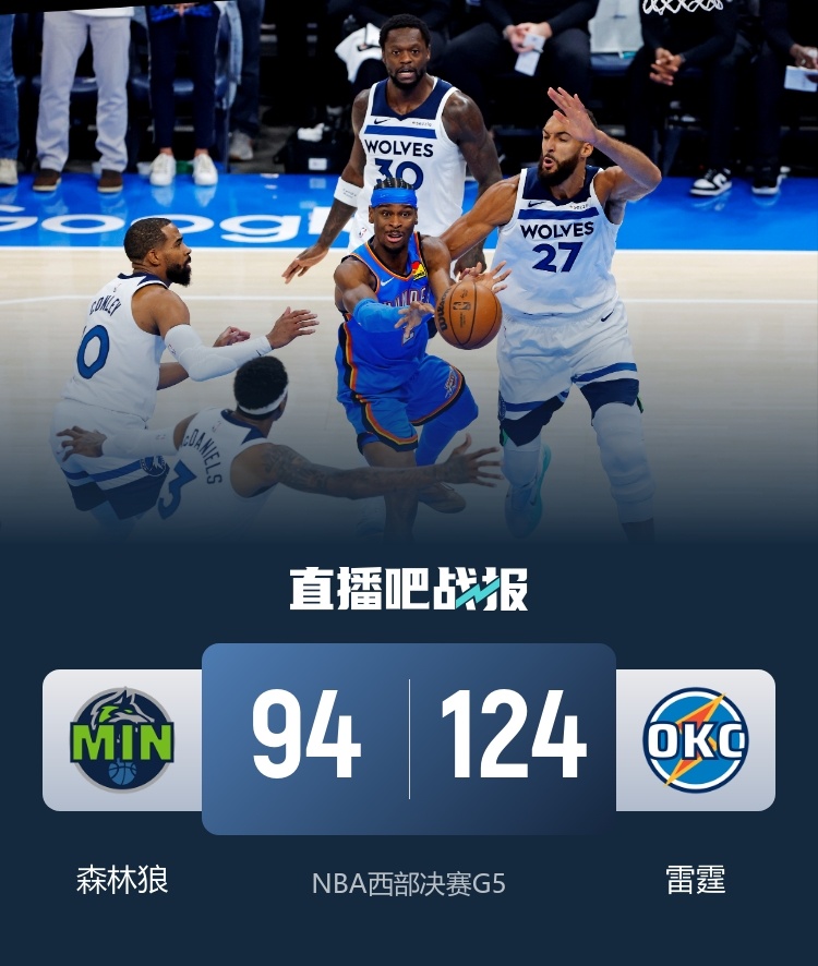 比赛开始,兰德尔开局扔进三分后森林狼近5分钟没有得分,雷霆慢热后迅速调整回应11-0建立主动权,随后亚历山大有攻有传带队继续扩大到17分领先,次节雷霆继续发力拉开20分以上领先,森林狼众将始终没人回应,杰伦威发威单节上双,霍姆格伦和亚历山大继续出色发挥,雷霆半场领先到30分以上。下半场,双方展开拉锯战,兰德尔终于发力,里突外投单节砍下13分,联手爱德华兹带队缩小分差,但亚历山大依然能回应,三节雷霆还领先26分,末节雷霆接连外线发炮重新拉开30分以上领先,随后双方换上替补练兵,最终雷霆124-94大胜森林狼,总比分4-1晋级总决赛!