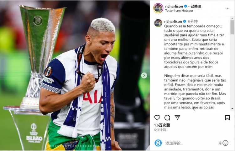 理查利森写道:“这个赛季开始时,我唯一想要的就是保持健康,帮助我的球队度过一个更好的赛季。我知道这对我来说在心理上很重要,也希望能以某种方式回报过去几年里来热刺球迷和所有支持我的人的关爱。