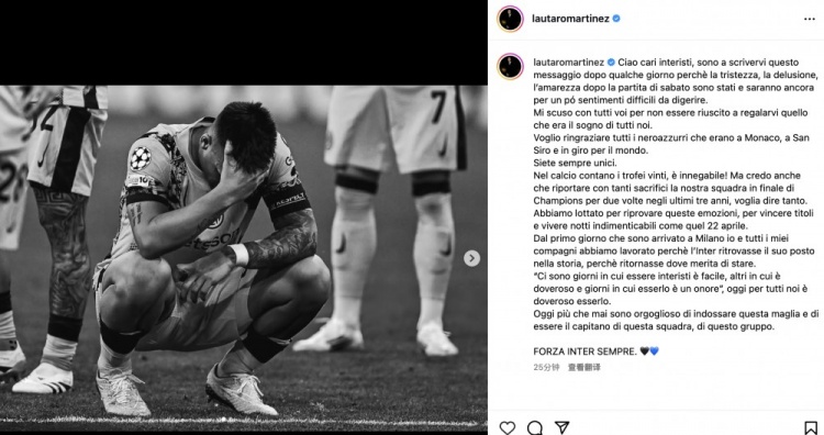 6月5日讯 国际米兰在欧冠决赛中5球惨败巴黎,无奈吞下本赛季四大皆空的苦涩。国米队长劳塔罗更新社交媒体发长文致歉蓝黑球迷,言辞情真意切,令人动容。