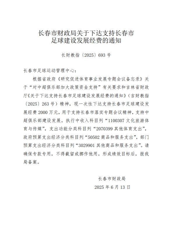 根据省政府《研究促进体育事业发展专题会议备忘录》关于“对中超俱乐部加大政策资金支持”有关要求和吉林省财政厅《关于下达支持长春市足球建设发展经费的通知》(吉财教指〔2025〕263 号)精神,现一次性下达支持长春市足球建设发展经费 2000 万元,用于支持长春市落实专题会议精神,支持中超俱乐部建设发展。执行中收入科目列“1100307 文化旅游体育与传媒”,支出功能分类科目列“2070399 其他体育支出”,政府预算支出经济分类科目列“50502 商品和服务支出”,部门预算支出经济分类科目列“3029901 其他商品和服务支出”。请确保专款专用,不得截留或挪作他用。形成绩效目标后,报我局备案。