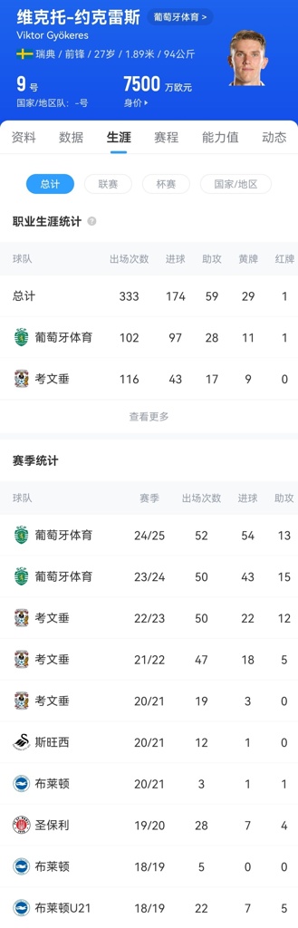 本赛季约克雷斯又交出了更好的数据,出战52场54球13助攻,但其中有19粒点球,是之前一赛季的两倍还多。去年12月他的德转身价涨至7500万欧,今年也停滞在了这个数字。