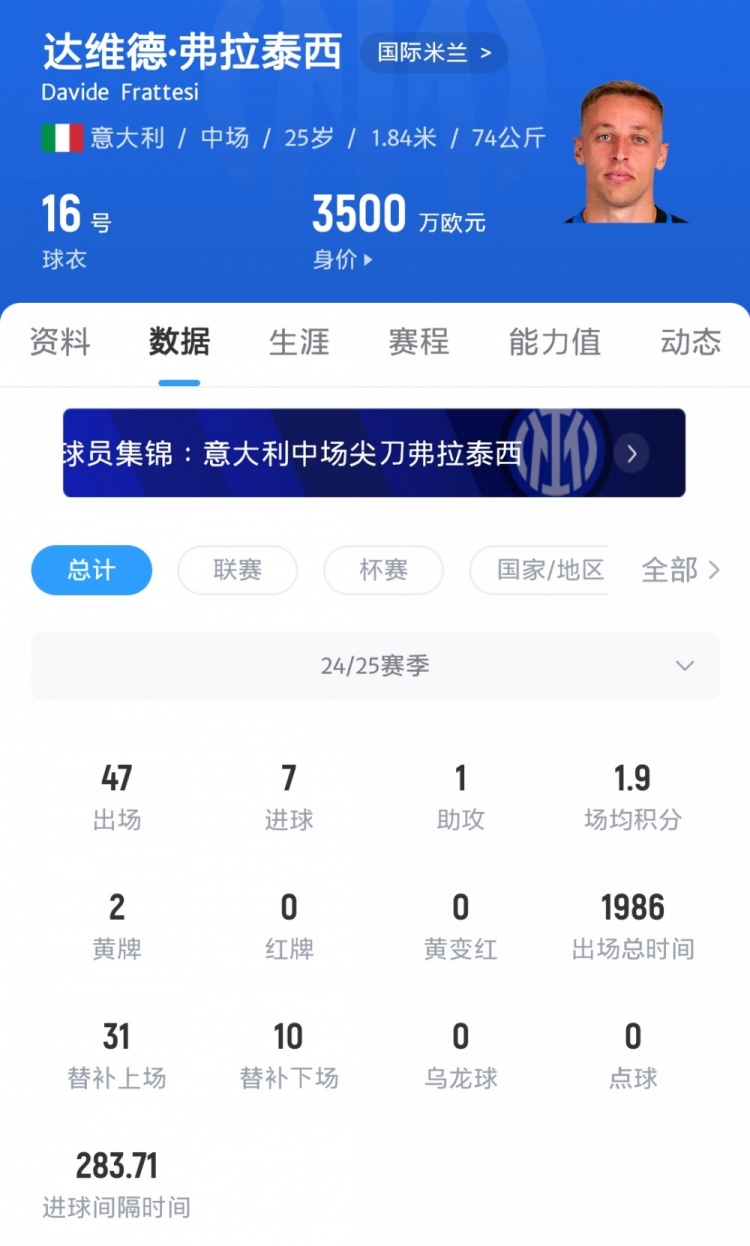 有消息人士透露:“英超俱乐部长期以来都在关注弗拉泰西,现在他的身价从5000万欧元降至约3500万,让这笔交易更加吸引兴趣。”曼联和热刺的意向是较为浓厚的,但球员本人是否愿意转会至英超赛场仍不太确定。而且弗拉泰西尚未表达离队意愿,从阵容的角度来说他仍将是国米的重要角色。