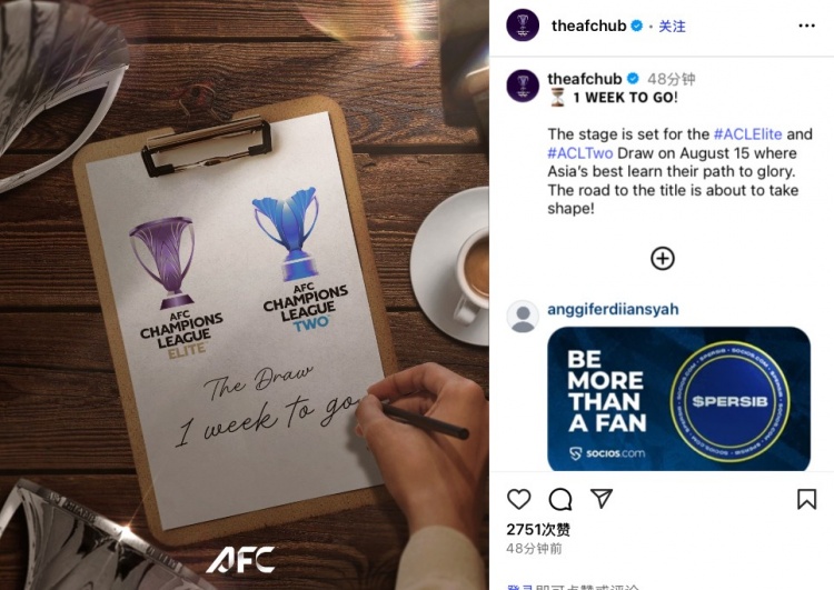 亚足联官媒配文写道:“距离抽签仪式还有一周!亚冠精英联赛和二级联赛抽签将在8月15日举行,舞台已经准备好了,通往冠军之路即将成行!”