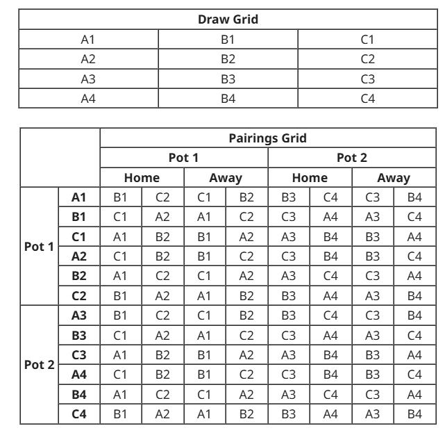 根据抽签表格,以西区为例,第一档球队将落位A1-C2中的任意一个序号,第二档球队对应落位A3-C4,确保一支球队将与八支不同球队(一档四队、二档四队)进行四个主场、四个客场的比赛。