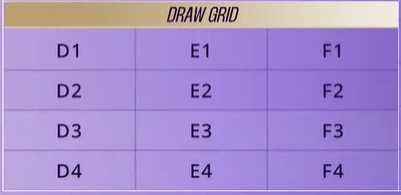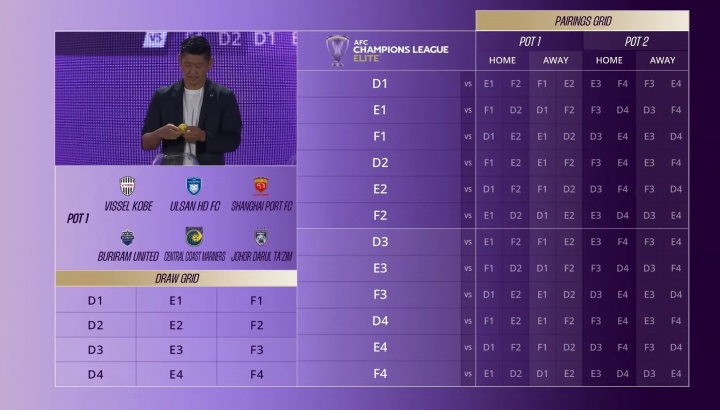 东亚区同理,12支球队对应进行抽签编号,一档球队落位前两行(D1-F2),二档球队落位后面两行(D3-F4)。伴随着球队编号落位,对应的联赛阶段对手将实时确定。