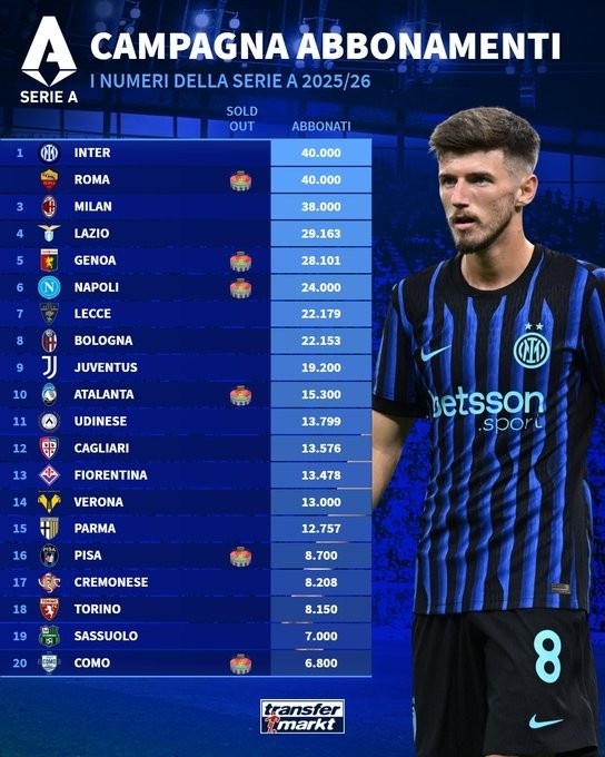 9月25日讯 2025-26赛季意甲各队季票销售数量榜出炉,其中国米、罗马4万张并列第一。