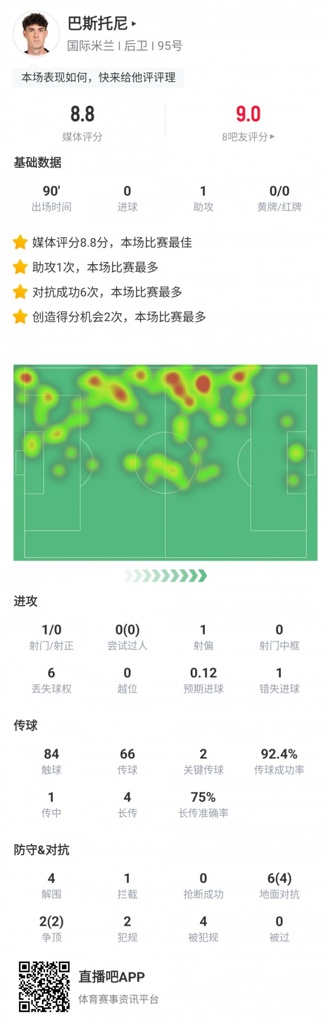10月1日讯 国米在本轮欧冠3-0大胜布拉格斯拉维亚,巴斯托尼首发出场踢满90分钟,以下是他的个人数据: